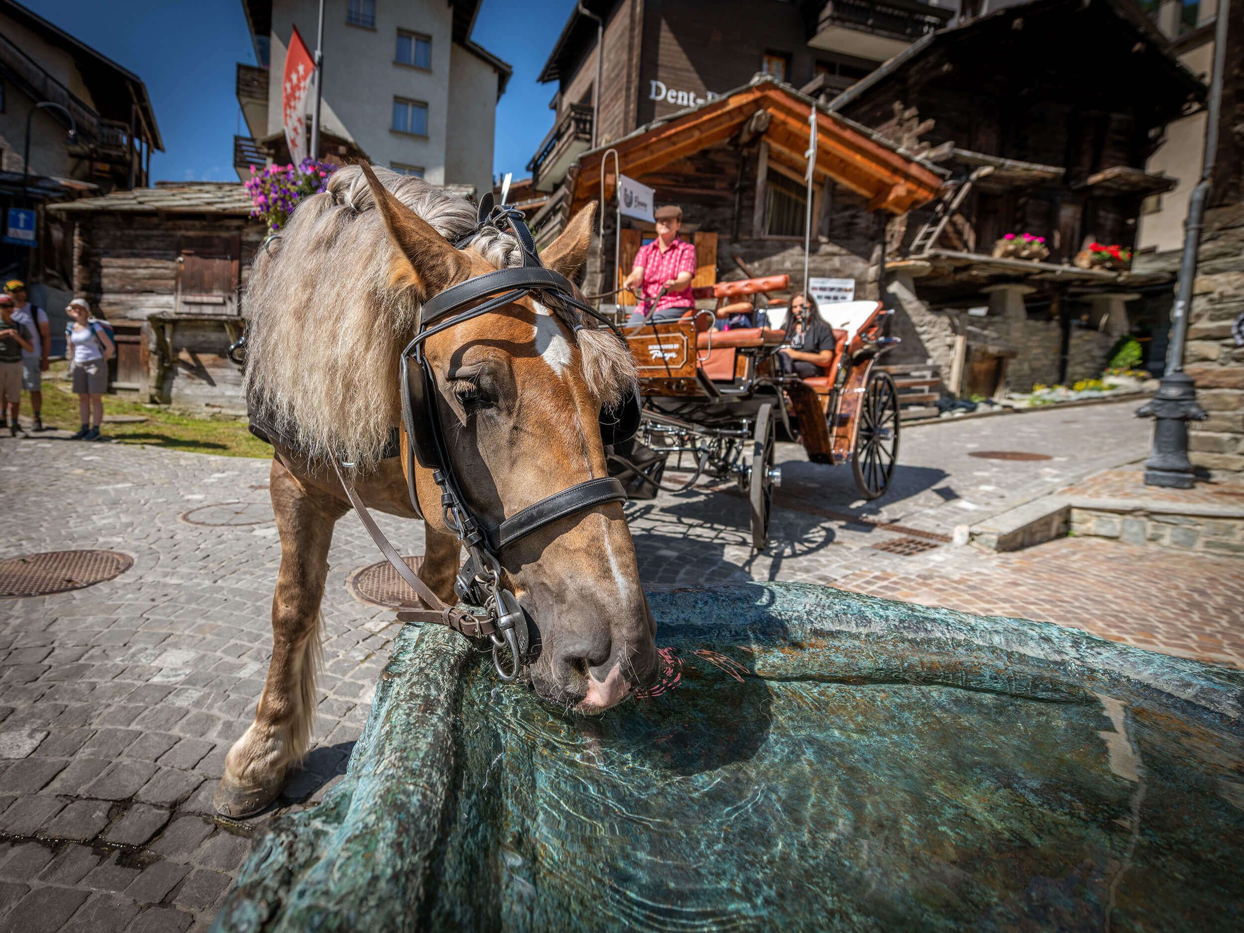Je m’appelle Benny, le cheval de calèche. J’ai deux métiers très intéressants. En début de semaine, j’ai l’honneur de distribuer des colis dans le Zermatt sans voiture et en fin de semaine, je promène les gens dans notre beau village.