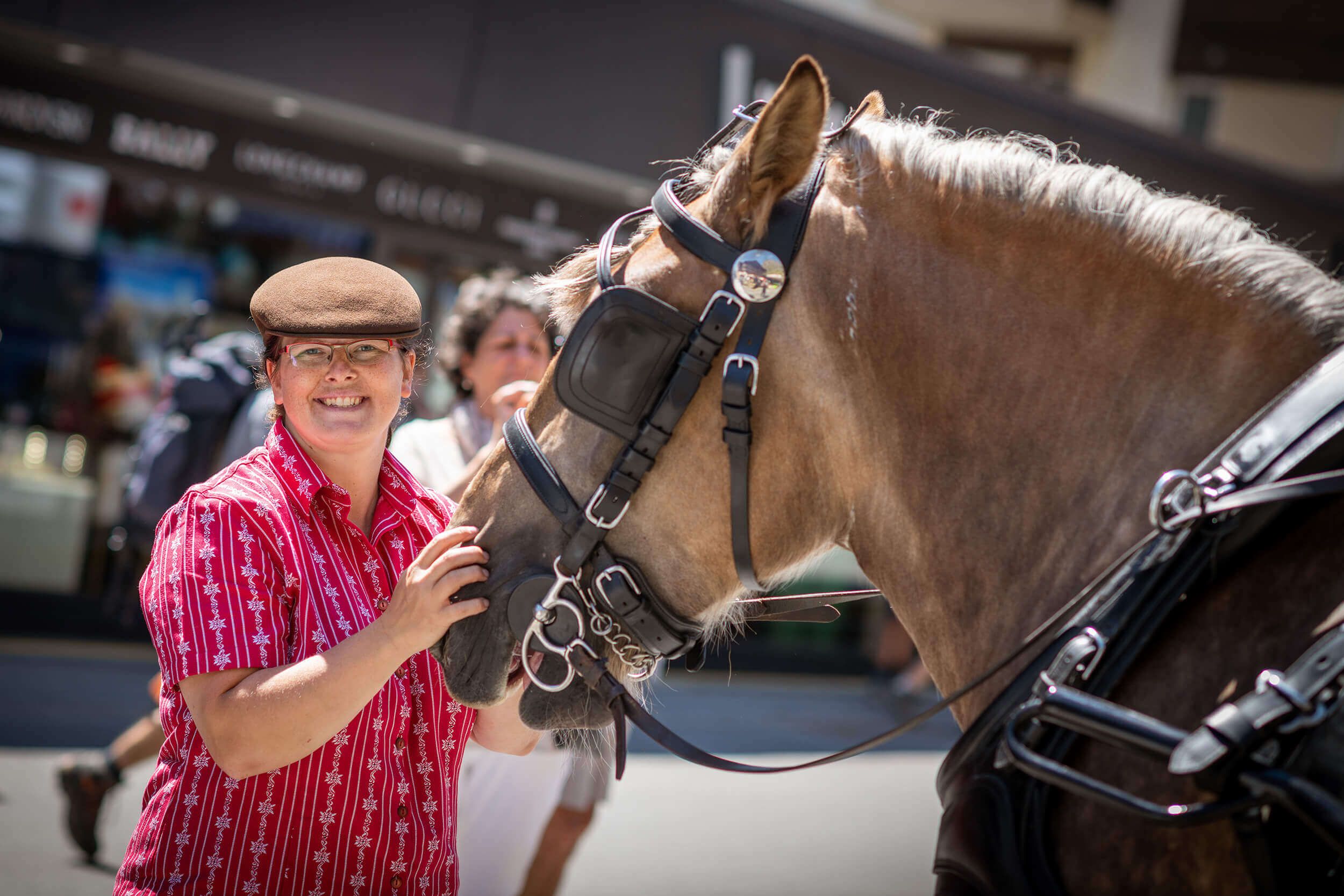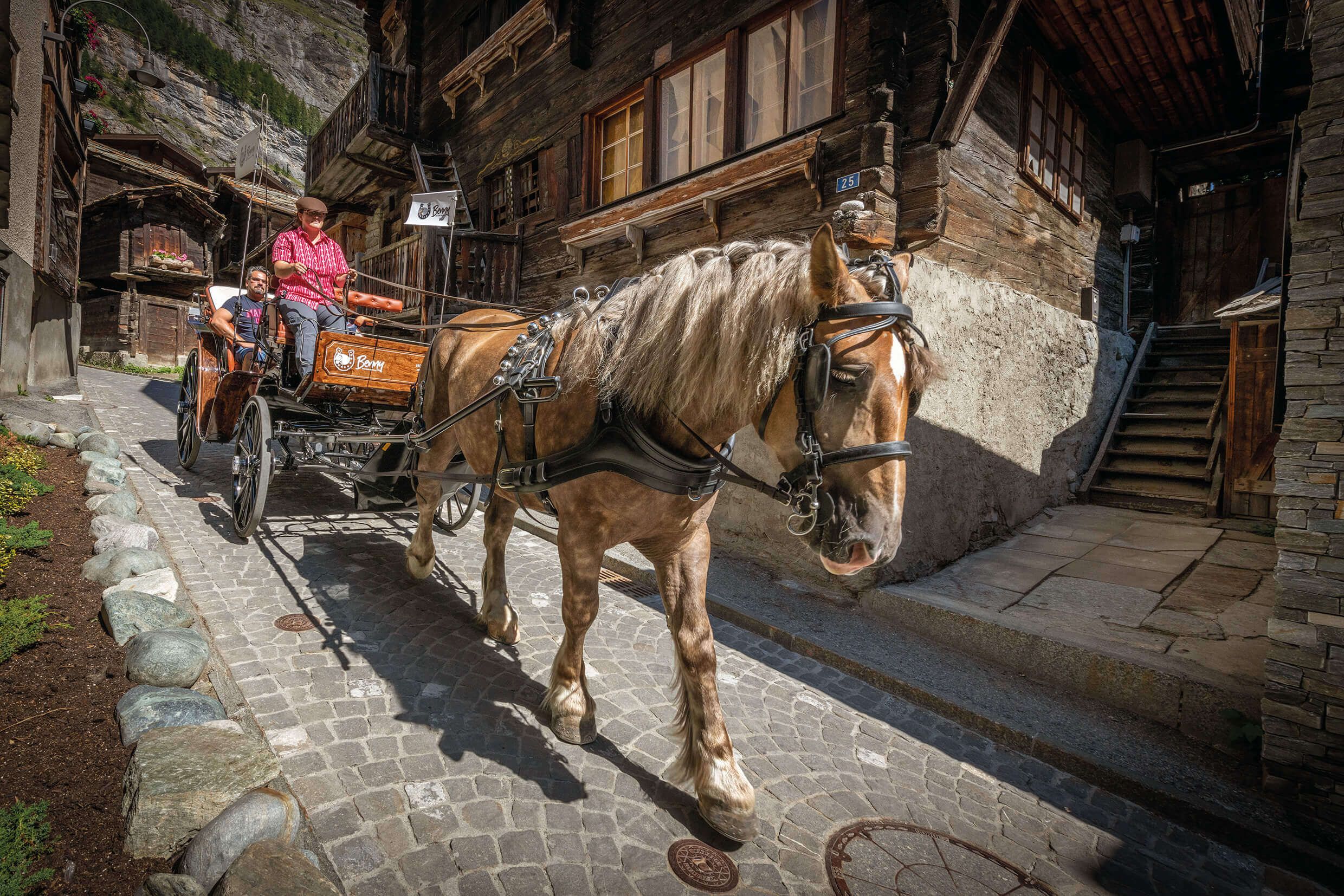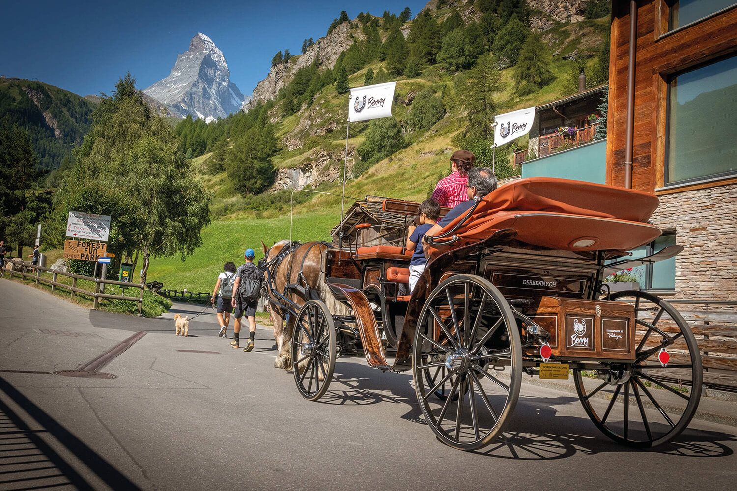 I’m Benny the carriage horse. I have two exciting jobs. At the start of the week, I deliver packages in car-free Zermatt, and at the end of the week, I drive visitors around our beautiful town.